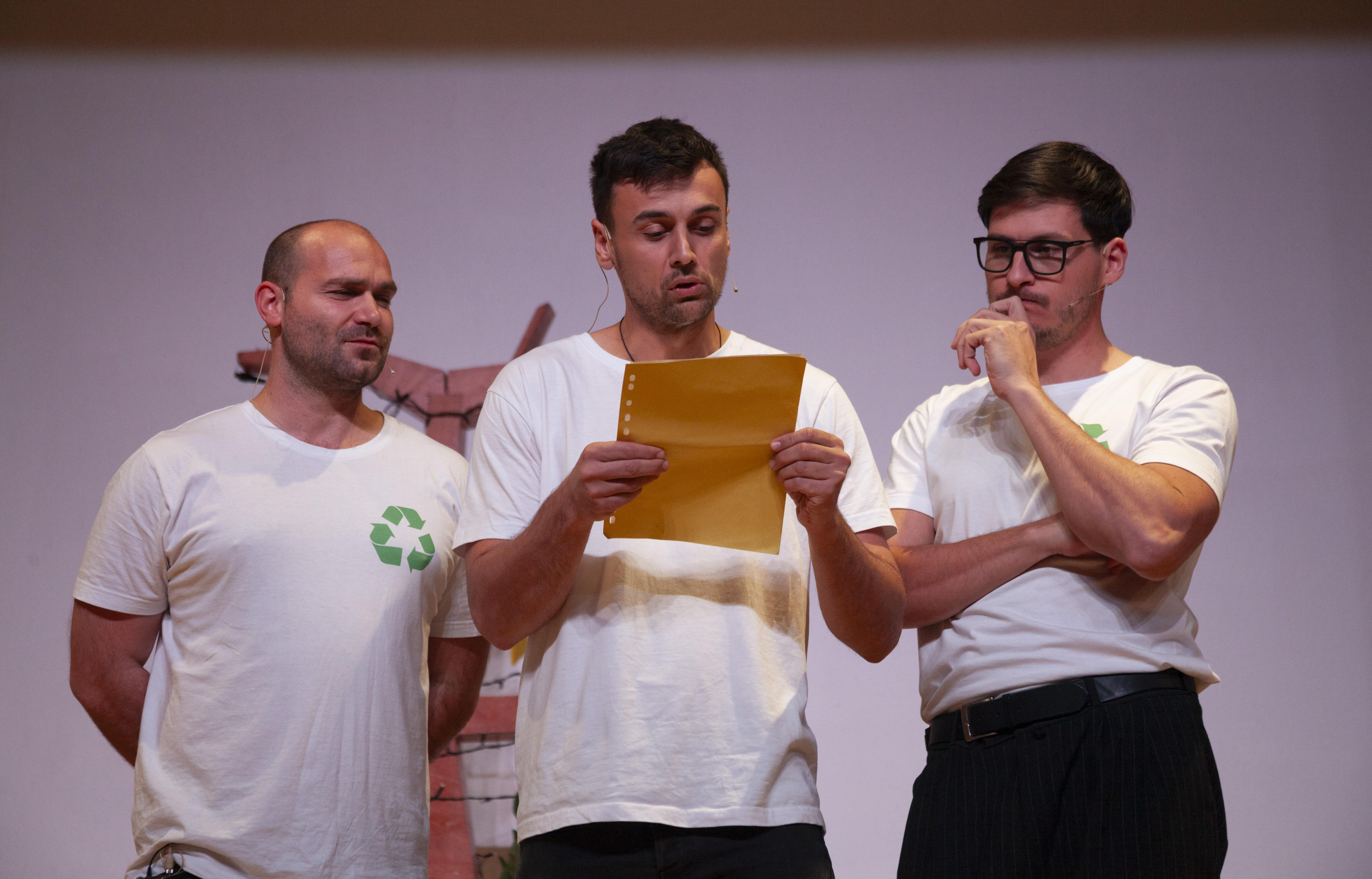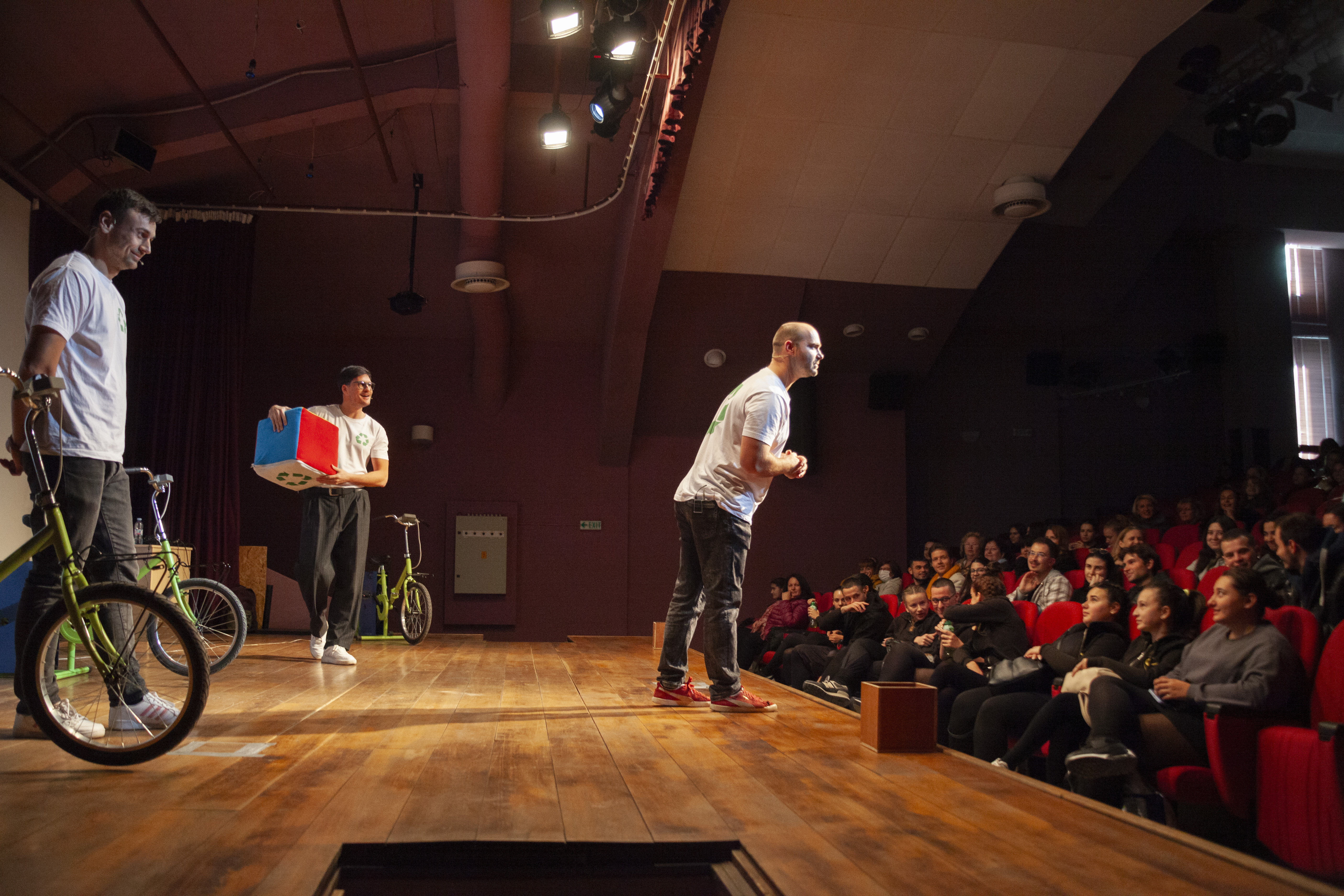 The artistic team of FECE, composed of three talented actors—Veselin Petrov, Ivan Stanchev, and Mihail Sarvanski—has crafted a unique and engaging theatre experience inspired by the Green E.Th.I.Cs Game (GEG). With their extensive backgrounds in improvisational theatre, the team has transformed environmental education into a captivating performance titled “лЕКО ЗАКЪСНЕЛИ?” (Slightly Delayed?).
